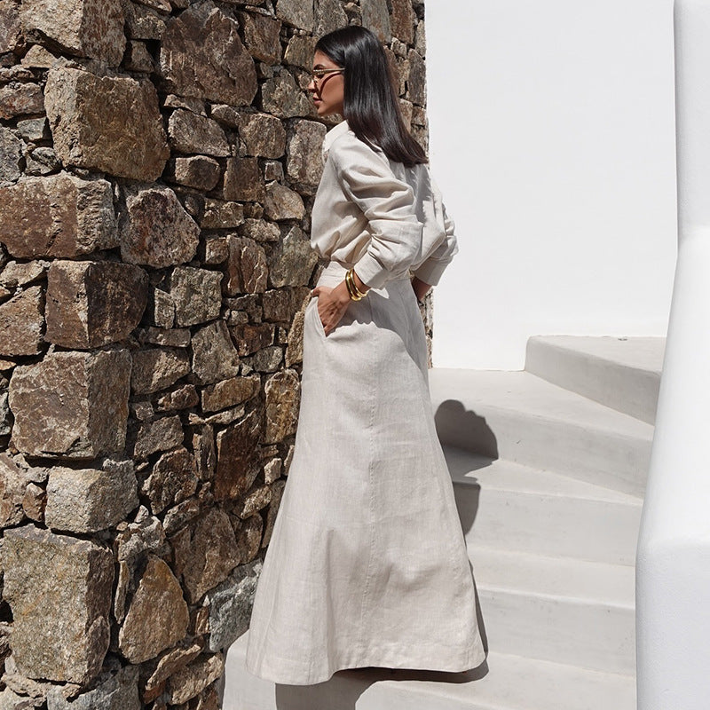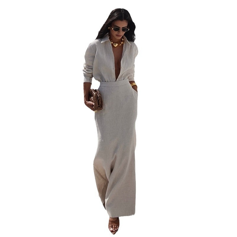 Elevate your wardrobe with this elegant beige two-piece skirt suit, paired with a stylish plunge blouse. The skirt offers a classic silhouette for a polished look, while the blouse’s subtle plunge adds a modern touch. Perfect for professional settings or special occasions, this ensemble balances sophistication with confident style, ensuring you feel empowered and poised throughout your day.