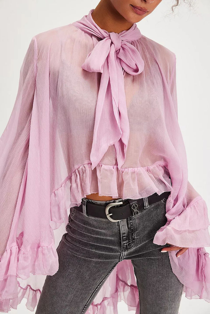 The Sheer Pink Bow-Tie Ruffle Blouse offers a soft, feminine touch to your wardrobe with its lightweight, sheer fabric and delicate ruffle details. The bow-tie neckline adds a classic charm, making it easy to pair with your favorite skirts or trousers for a comfortable yet polished look. Perfect for days when you want to feel effortlessly elegant and confident.