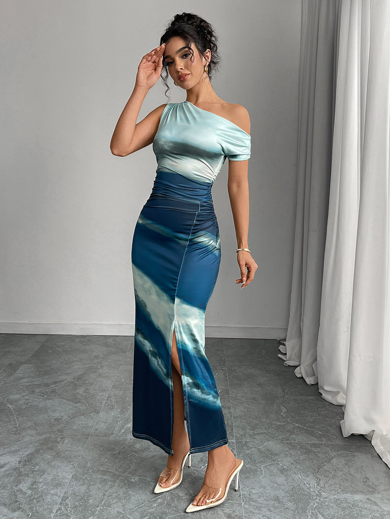 Elegant One-Shoulder Tie-Dye Maxi Dress with Side Slit